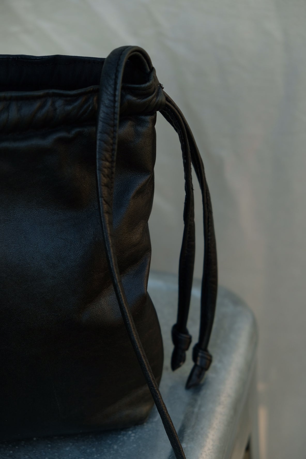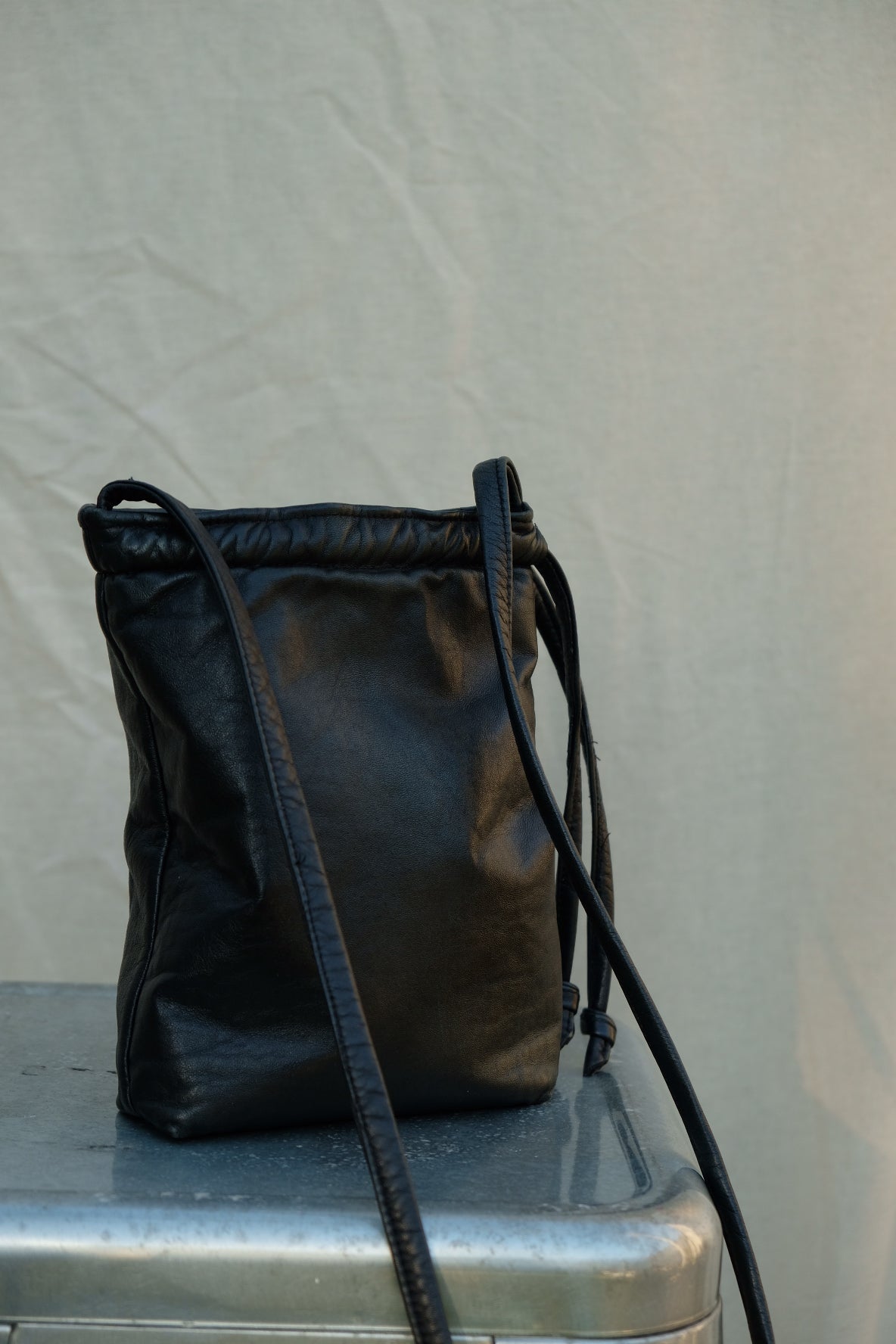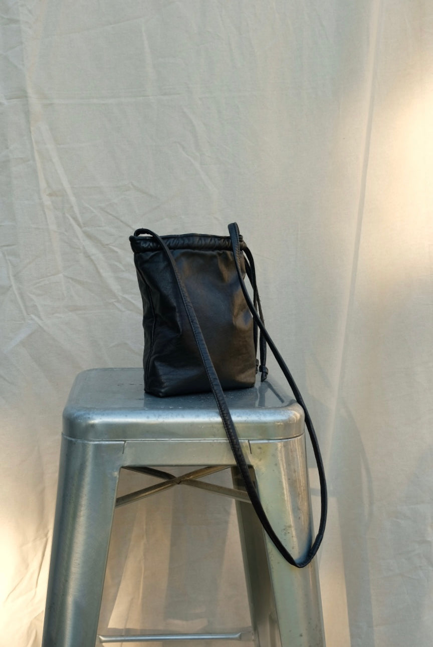 It features a leather drawstring closure, and the strap can be made to your specifications.