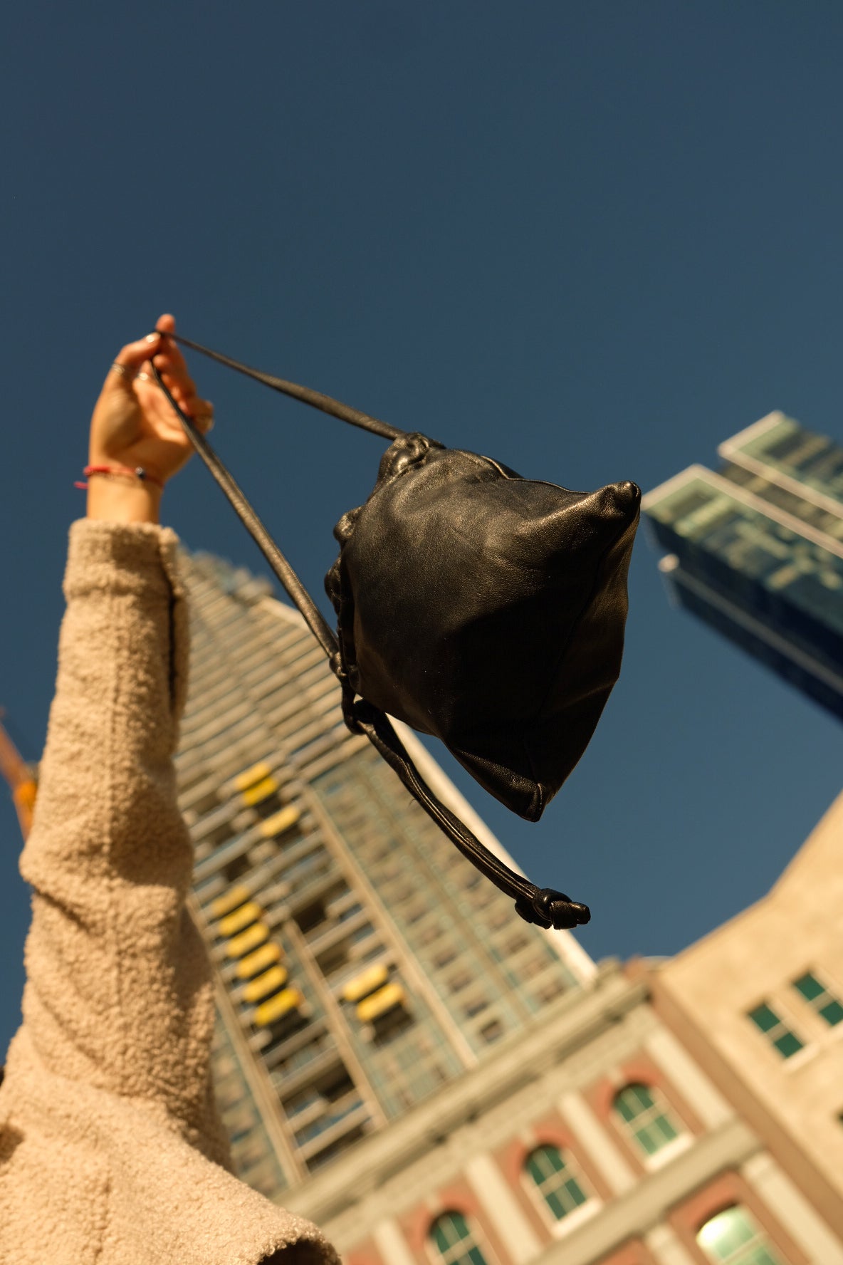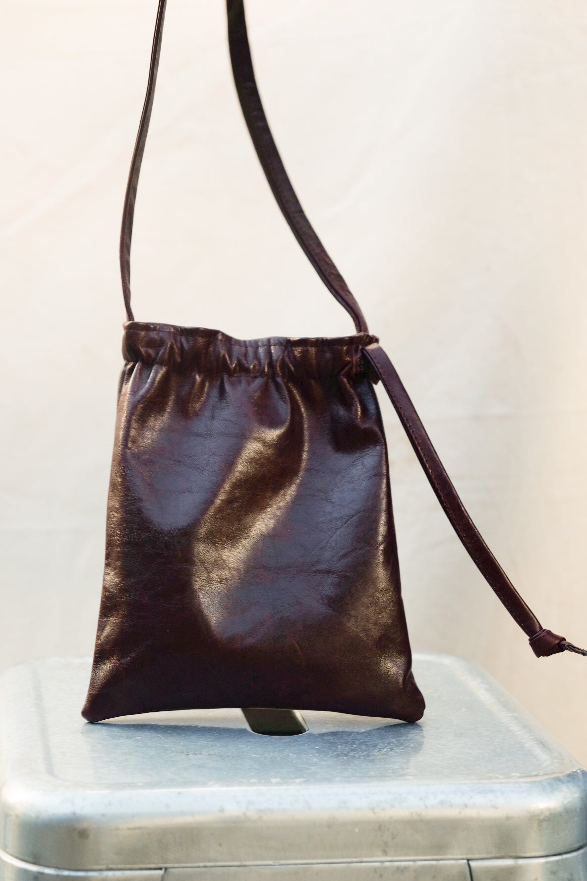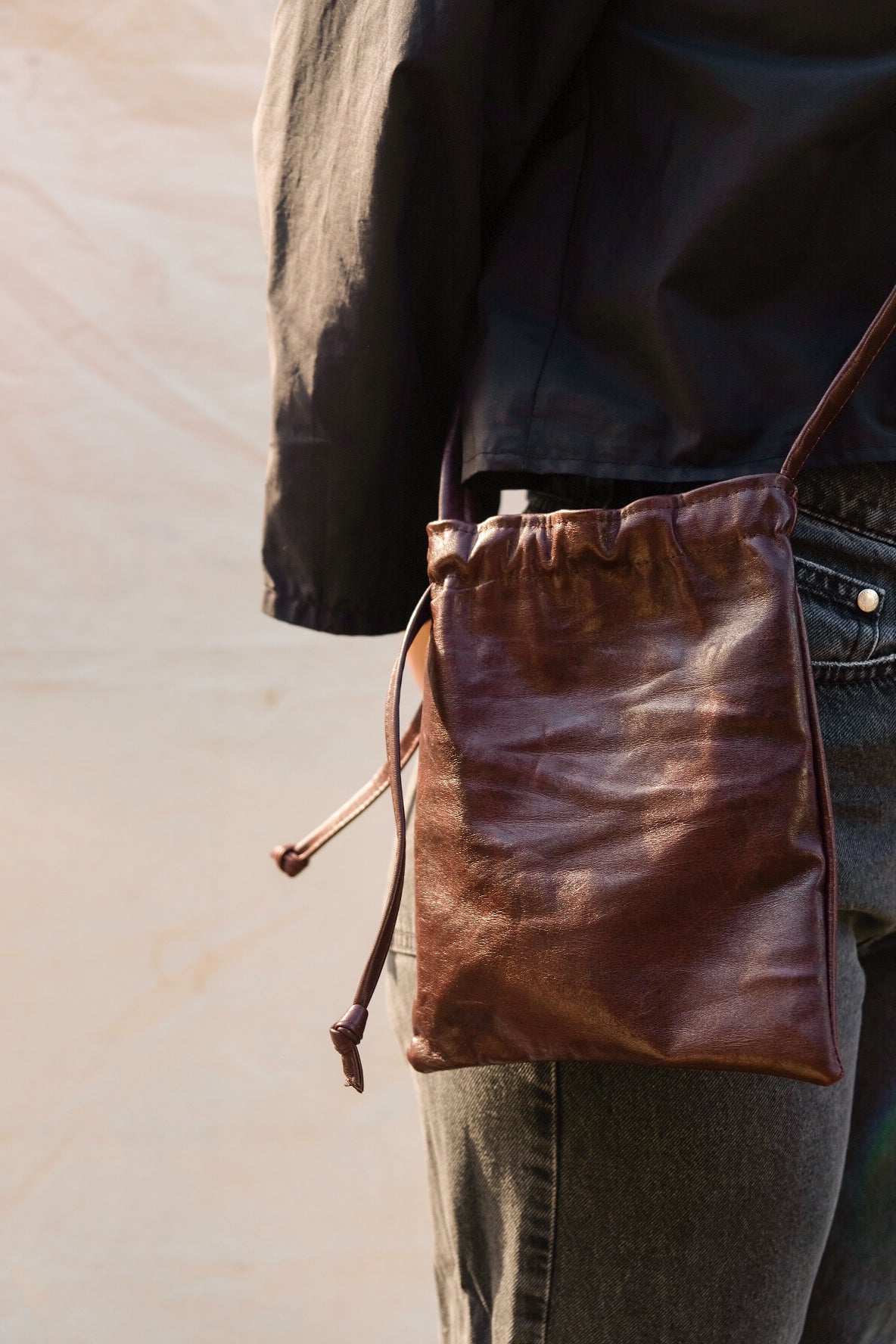 It features a leather drawstring closure, and the strap can be made to your specifications.