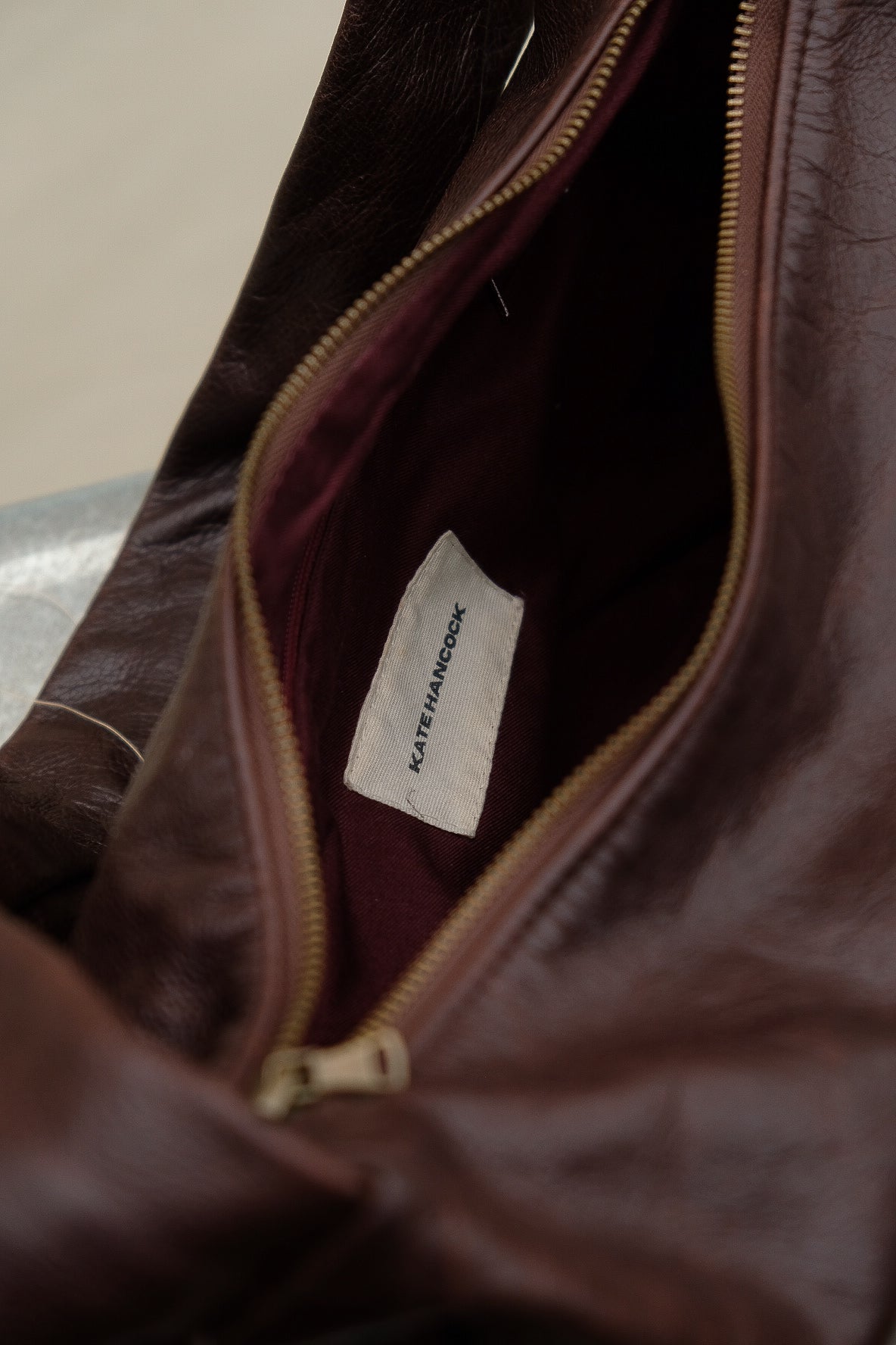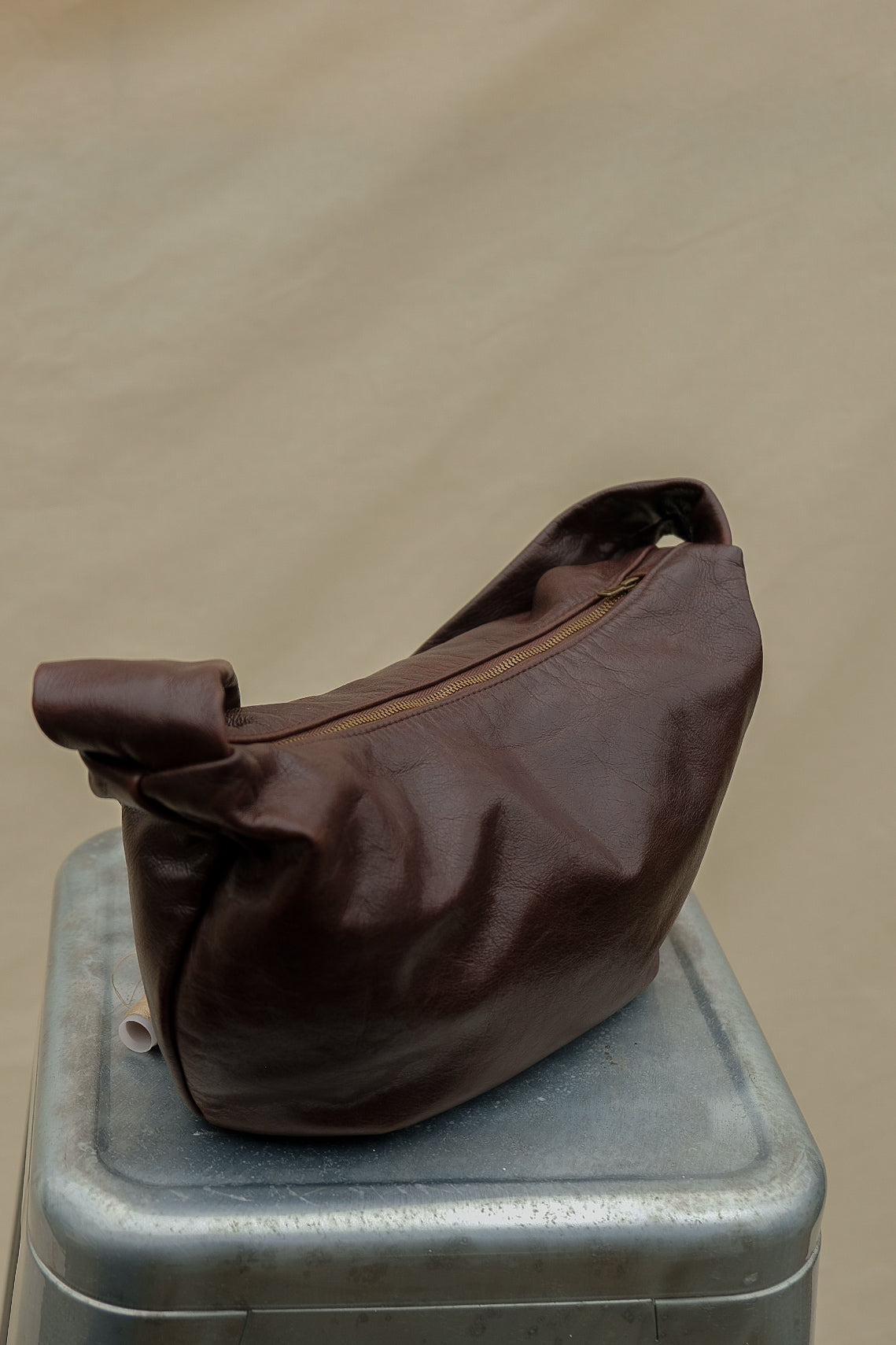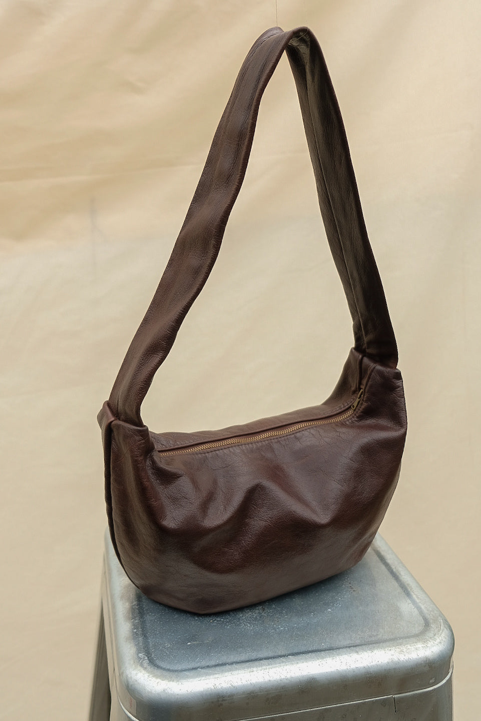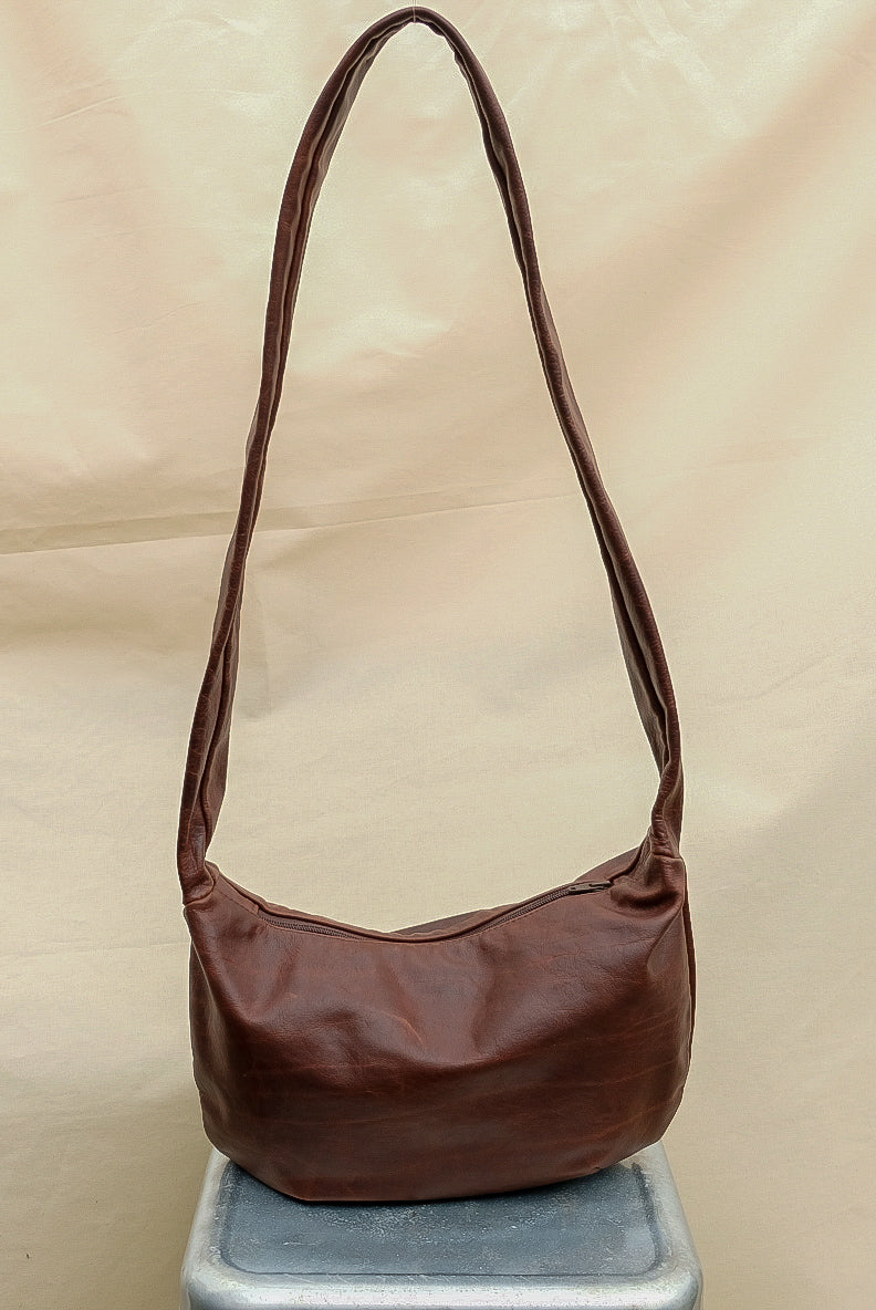 This bag can be made as a crossbody or as a shoulder bag. It features large darts on the bottom to give stability and has an internal pocket.